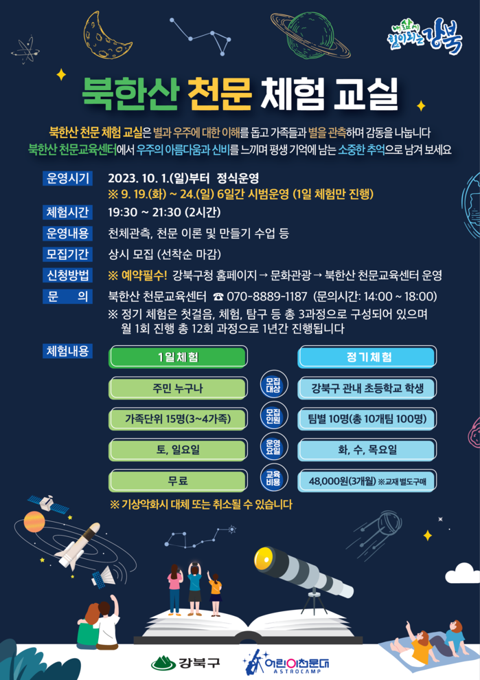 [시민일보 = 홍덕표 기자] 강북구(구청장 이순희)는 북한산천문교육센터 조성을 완료하고, 오는 10월부터 다채로운 천문체험 프로그램을 운영한다고 밝혔다.