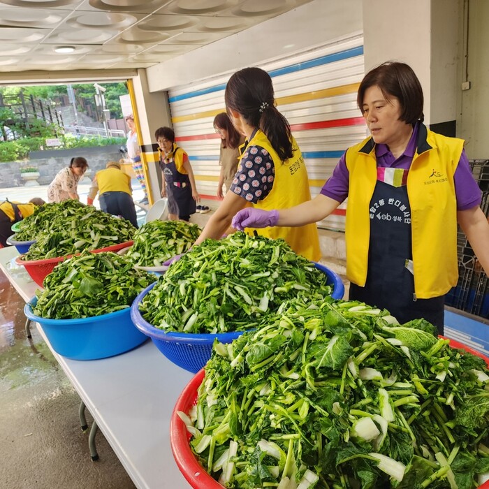 돈암2동 지역사회보장협의체 위원 및 반디봉사회 회원 20여 명은 이른 아침부터 직접 열무 및 각종 재료를 다듬었다.