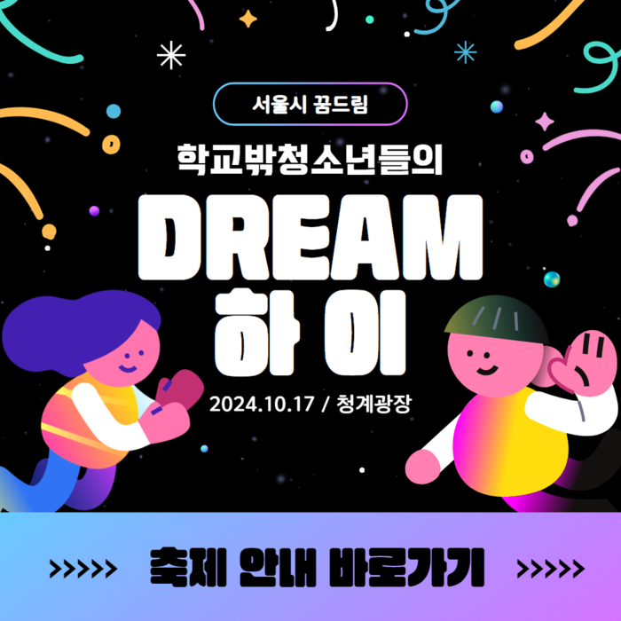 [시민일보 = 이대우 기자] 서울시학교밖청소년지원센터 꿈드림(센터장 유혜진)(이하 서울시 꿈드림)에서는 서울시 내 학교 밖 청소년들의 연합 행사 Dream 하이!를 17일 오후 2~8시 청계광장(서울시 중구 소재)에서 개최한다.