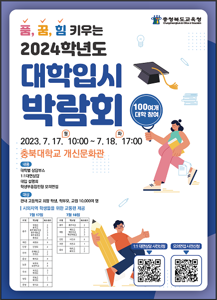 [청주=최성일 기자] 충청북도교육청(윤건영 교육감)이 도내 고등학생들의 진학을 지원하기 위하여 「품, 꿈, 힘 키우는 2024학년도 대학입시 박람회」를 운영한다.