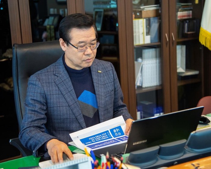 성장현 서울 용산구청장이 최근 ‘2022년 적극행정 직장 교육’을 들었다. 이번 교육은 비대면(온라인) 형태로 진행됐으며 구청 전 직원이 교육 대상이다. 사진은 성 구청장이 교육에 집중하고 있는 모습. (사진제공=용산구청)
