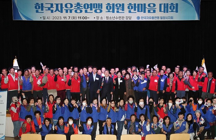 | ▲ 7일 밀양시청소년수련관에서 개최된 한국자유총연맹 회원 한마음대회 참석자들이 단체 기념촬영을 하고 있다 |