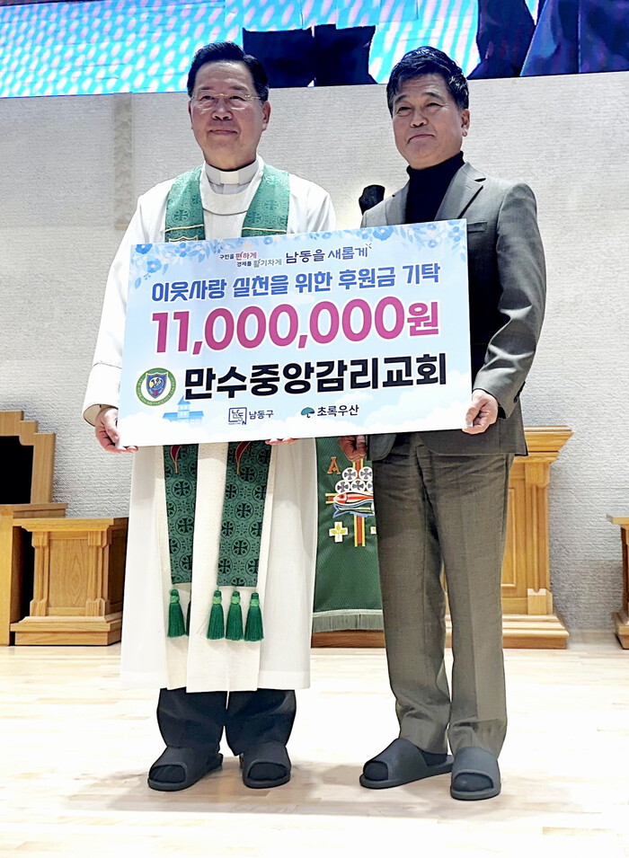 [인천=문찬식 기자] 인천 남동구는 만수중앙감리교회(담임목사 황규호)로부터 이웃돕기 후원금 1,100만 원을 기탁받았다고 밝혔다.