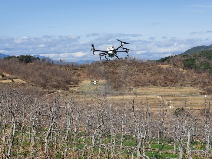 드론을 활용한 과수화상병 방제는 과수원에 들어가지 않고도 손쉽게 방제를 끝낼 수 있어, 하루 40~50ha의 면적을 방제할 수 있다.