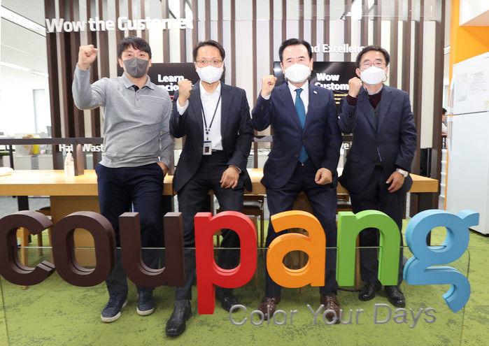 | ▲ 쿠팡 본사를 방문한 서춘수 군수(오른쪽 두번째)가 직원들과 화이팅을 외치는 모습(사진제공=함양군청) |