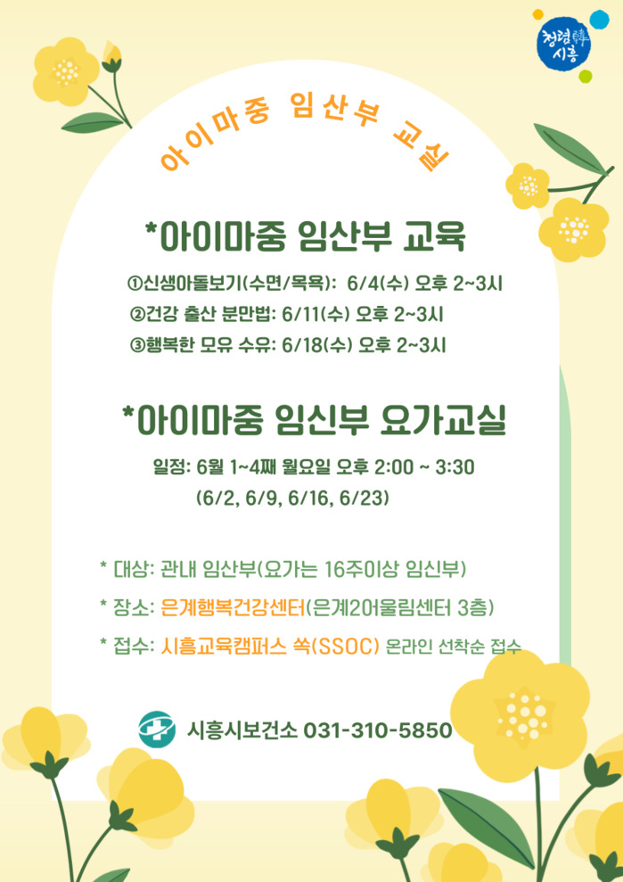 이번 프로그램은 오는 6월 3일부터 23일까지 은계행복건강센터(은계2어울림센터 3층)에서 진행되며, 시흥시에 거주하는 임산부라면 누구나 참여할 수 있다.