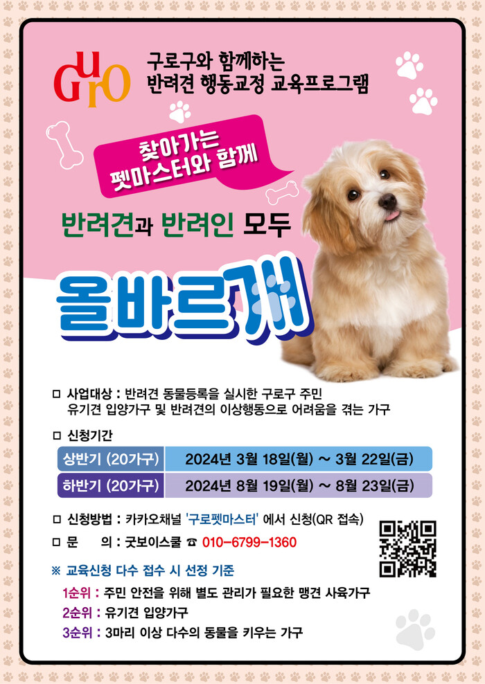 신청 방법은 카카오 채널 ‘구로구 찾아가는 펫마스터’를 통해 총 20가구를 모집하며, 수강료는 전액 무료이다.