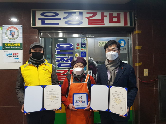 충남 아산시 온양4동 행복키움추진단은 최근 은정갈비와 온양4동 찾아가는 보건복지 서비스 실현을 위한 후원협약을 체결했다. 협약을 통해 은정갈비에서 매월 제공하는 후원금을 온양4동 저소득층 및 복지사각지대에 있는 어려운 이웃에게 전달할 예정이다. 사진은 협약식에서 관계자들이 기념촬영을 하는 모습. (사진제공=아산시청)