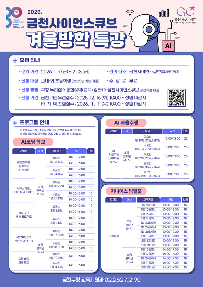 모든 프로그램은 무료로 운영된다. 금천구 초등학생은 오는 16일 오전 10시부터 홍보물의 정보무늬(QR코드) 또는 금천구청 누리집 '통합예약'-'교육/강좌'-'금천사이언스큐브'에서 선착순으로 신청할 수 있다. 자세한 일정은 신청 화면과 홍보물에서 확인하면 된다.