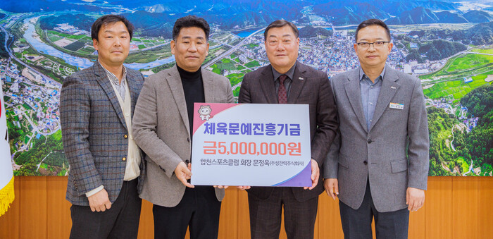 김윤철 합천군수는 “우리 지역의 체육발전을 위해 큰 힘을 보태주신 데에 감사드린다”면서, “기탁하신 기금을 체육인재 발굴 및 합천군 체육발전 및 인프라 개선을 위해 소중하게 사용하도록 노력하겠다”고 감사 인사를 전했다.