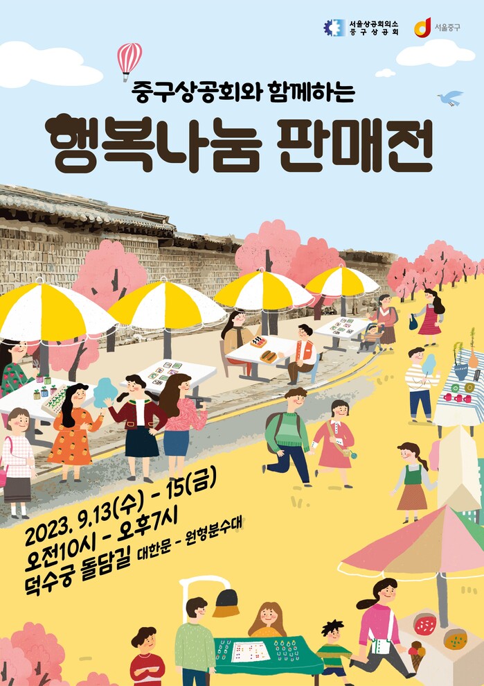 [시민일보 = 여영준 기자] 중구(구청장 김길성)는 오는 13~15일 오전 10시~오후 7시 덕수궁 돌담길에서 지역내 우수 소상공인 제품을 전시하고 판매하는 ‘행복 나눔’ 판매전을 연다고 밝혔다.