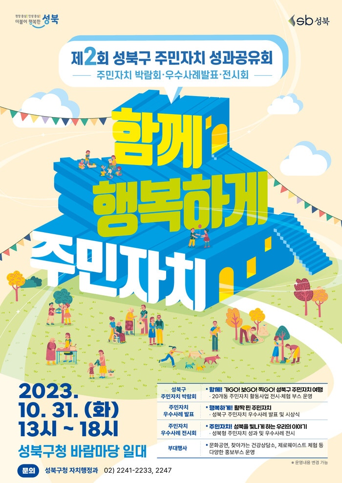 [시민일보 = 홍덕표 기자] 성북구(구청장 이승로)가 31일 구청 바람마당에서 ‘함께! 행복하게! 성북의 주민자치!’라는 슬로건 아래 마을의 변화를 이끌어 온 각 동의 주민자치회 활동을 공유하는 ‘제2회 성북구 주민자치 성과공유회’를 개최한다.