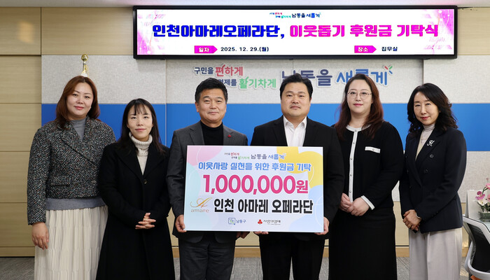 [인천=문찬식 기자] 인천 남동구는 인천 아마레 오페라단으로부터 사회복지시설 및 단체를 지원을 위해 1백만 원을 기탁받았다고 전했다.