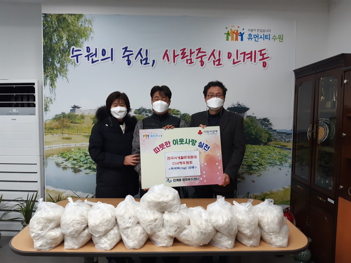 경기 수원시 팔달구 인계동 행정복지센터는 최근 (사)한국식생활문화협회 다사랑위원회로부터 20만원 상당의 떡국떡(1kg) 20봉을 전달받았다. 전달된 물품은 지역내 홀몸노인 20가구에 전달될 예정이다. 사진은 전달식에서 관계자들이 기념촬영을 하는 모습. (사진제공=팔달구청)