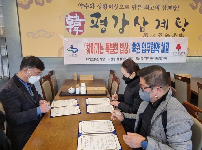 경기 수원시 권선구 곡선동은 최근 동 지역사회보장협의체와 함께 용인 소재 평강고봉삼계탕을 찾아 ‘찾아가는 특별한 밥상’ 후원 협약을 체결했다. 이번 협약을 통해 매주 삼계탕 5인분을 후원하던 평강고봉삼계탕은 앞으로 지속적인 후원을 약속했다. 사진은 협약식에서 관계자들이 협약서에 서명을 하고 있는 모습. (사진제공=권선구청)