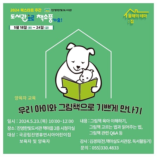 진영한빛도서관에서는 양육자 교육 외에도 5월 한달 간 도서관 로비와 어린이자료실에서 올해의 주제인 ‘집’을 테마로 하는 그림책 전시와 엽서, 스티커 등의 굿즈를 배포하며 북스타트를 홍보할 예정이다.