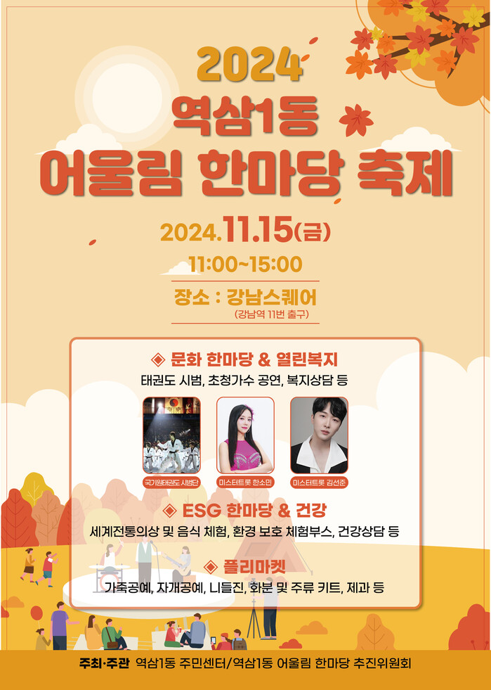 임경수 역삼1동장은 “관내 기업을 비롯해 소상공인과 주민 모두가 적극적으로 참여해 주신 덕분에 올해 역삼1동 어울림 한마당 축제가 더욱 풍성해졌다”며 “늦가을 정취가 가득한 금요일 오후에 주민과 인근 직장인 모두가 여유와 낭만을 만끽할 수 있는 자리가 되길 바란다”고 말했다.