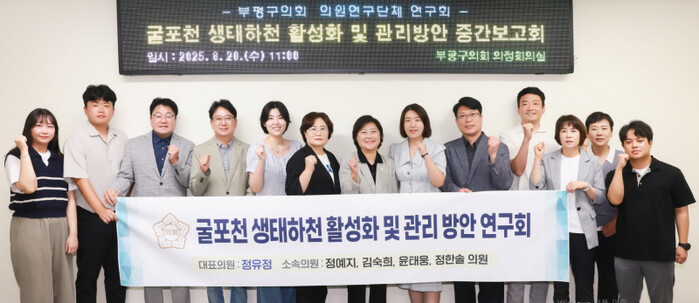 | 의원 연구단체 ‘굴포천 생태하천 활성화 및 관리 방안 연구회’ 연구용역 중간 보고회 참가자들이 포즈를 취하고 있다. |