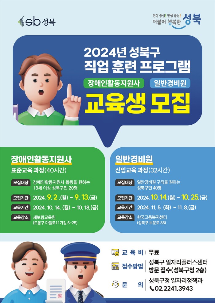 [시민일보 = 문민호 기자] 성북구(구청장 이승로)가 지역내 중·장년층의 구직 수요가 많은 직종인 일반경비원에 대한 구민의 취업 기회를 확대하고자, 오는 11월 '일반경비원 신임교육 과정'을 운영한다고 6일 밝혔다.