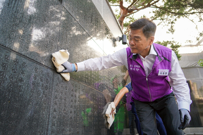 15일 구에 따르면, 이날 이필형 구청장은 환경미화원 20여 명과 함께 참전유공자 성명 및 공적내용이 각인된 명비와 계단을 물로 깨끗이 청소하고 주변 잡초도 제거했다. 충혼의 벽에 내려앉은 먼지와 물기를 수건으로 깨끗하게 닦아낸 후, 순국선열과 호국영령에 대한 묵념과 헌화를 했다.