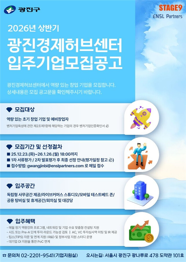 [시민일보 = 여영준 기자] 광진구(구청장 김경호)는 미래 성장 가능성을 갖춘 초기 창업기업을 육성하기 위해 2026년 상반기 광진경제허브센터 신규 입주기업을 모집한다고 밝혔다.