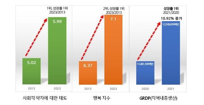 '사회적 약자에 대한 태도'는 2013년 25위에 불과했으나 2023년에는 1위를 달성했다.