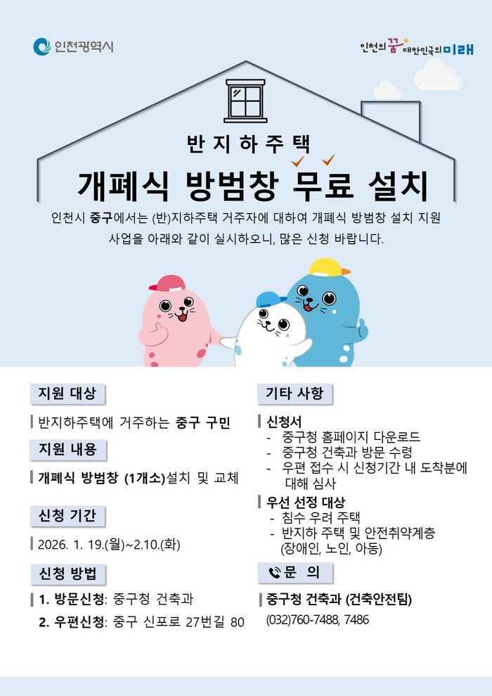 지원 대상은 인천시 중구에 소재한 반지하주택의 거주자다. 희망자는 1월 19일부터 오는 2월 10일까지 신청서 등 필수서류를 갖춰 인천 중구청(신포로 27번길 80) 건축과 건축안전팀으로 방문 또는 우편 신청하면 된다.