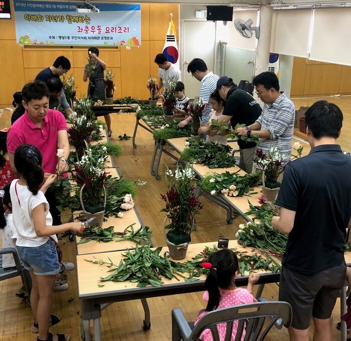 | ▲ 2019년 진행했던 아빠는 슈퍼맨 프로그램. 꽃꽂이와 샌드위치 만들기. (사진=성동구청 제공) |