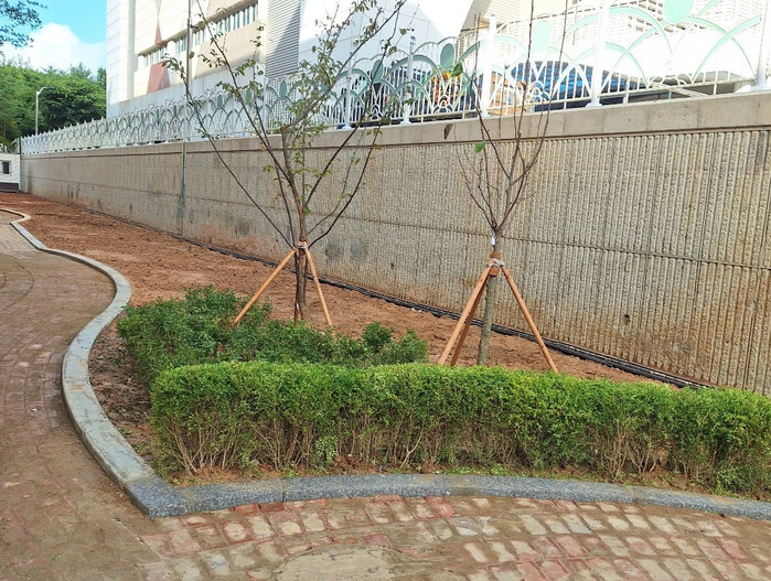 동부교육지원청은 변위가 발생한 L형 옹벽 60m 구간을 철거하고, 구조적 안정성이 높은 역T형 옹벽으로 재설치했으며, 새 옹벽 하부에는 생태 학습 텃밭을 조성해 학생들의 안전한 학습 환경을 마련했다.