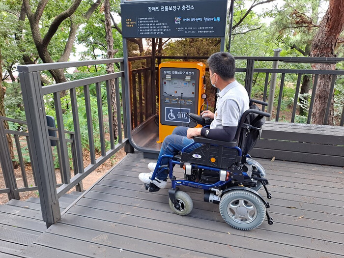 | ▲ 영축산 전동보장구 충전기 이용 모습. (사진=노원구청 제공) |