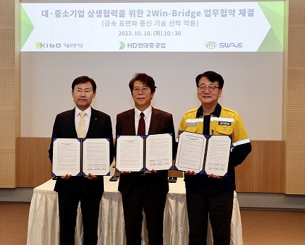 [부산=최성일 기자]기술보증기금(이사장 김종호, 이하 ‘기보’)은 HD현대중공업(주)(이하 ‘현대중공업’), ㈜써니웨이브텍과 함께 10일(화) 현대중공업 울산 본사에서 「대기업-중소기업 상생협력을 위한 2Win-Bridge 업무협약」을 체결했다고 밝혔다.