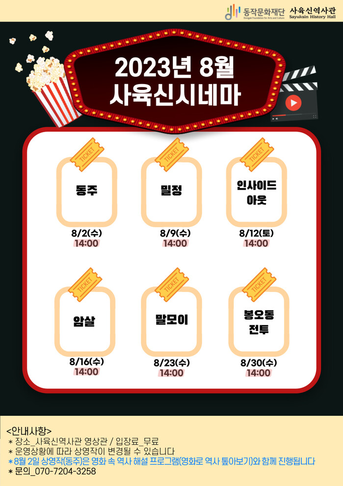 독립운동 배경의 역사영화부터 온 가족이 즐길 수 있는 애니메이션까지 다양한 연령대를 위한 ‘맞춤형’ 영화를 선사한다. 관람은 역사관을 방문한 구민이면 누구나 가능하며 어린아이의 경우 보호자를 동반해야 한다.