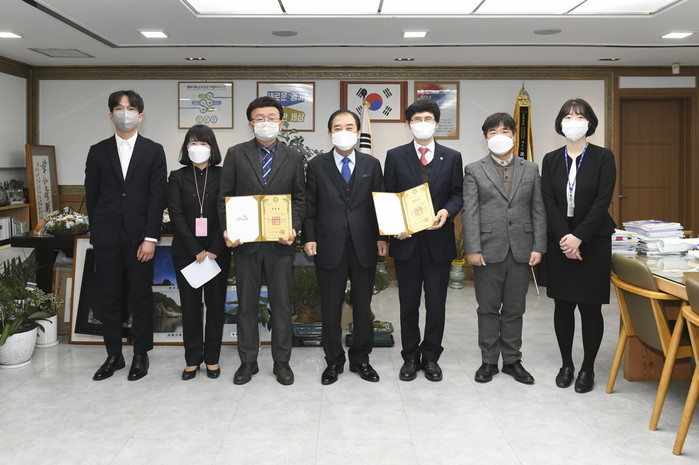 경기 포천시는 최근 세금문제로 고민하고 있는 시민들을 위해 김동천·최승일 세무사를 '제4기 마을세무사'로 위촉했다. 이들을 올해부터 2년간 국세와 지방세에 대한 세무상담 등 관련 상담을 지원하게 된다. 사진은 위촉식에서 박윤국 시장(가운데)과 마을세무사 및 관계자들이 기념촬영을 하는 모습. (사진제공=포천시청)