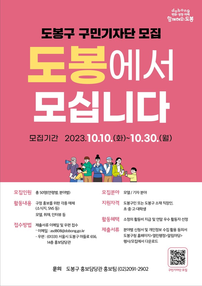 구민 또는 구 소재 직장인이나 초·중·고·대학교에 재학 중인 학생이면 누구나 도봉구 구민기자단에 참여할 수 있으며, 참여를 원하는 구민은 10~30일 구 홈페이지에서 지원서 등을 내려받아 작성한 뒤 담당자 이메일(asd808@dobong.go.kr) 또는 구 홍보담당관으로 우편 신청하면 된다.