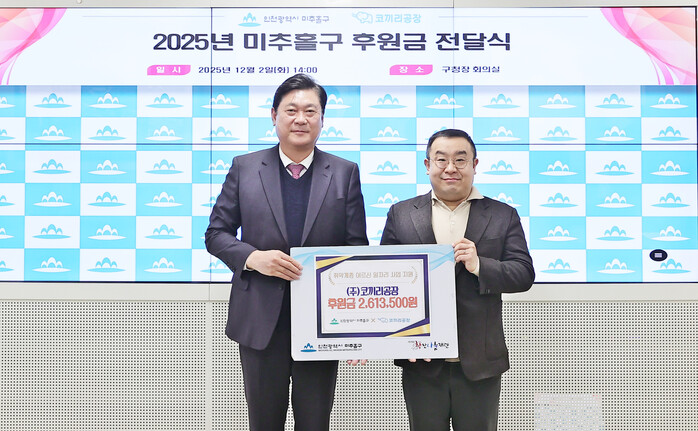 [인천=문찬식 기자] 인천 미추홀구(구청장 이영훈)는 지난 2일 구청장실에서 ㈜코끼리공장(대표 이채진)으로부터 취약계층인 어르신 일자리 지원을 위한 후원금 약 261만 원을 전달받았다.
