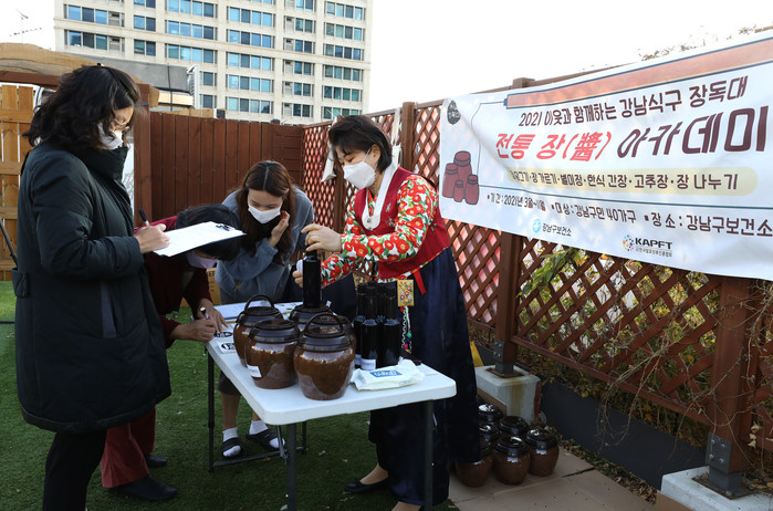 서울 강남구는 최근 강남구 보건소 옥상정원에서 올해 3월에 진행한 ‘전통 장(醬) 아카데미’에서 주민들이 직접 담근 된장·간장·고추장을 수령하는 '장 나누기' 행사를 개최했다. 사진은 장 나누기 행사가 진행되고 있는 모습. (사진제공=강남구청)