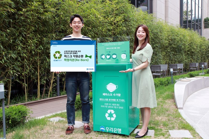 우리은행은 마스크 필터 제조사인 (주)제이제이글로벌과 협력해 사용 후 버려지는 폐마스크를 수거하고, 마스크 생산 과정에서 발생하는 자투리 원단을 활용해 재생 PP(폴리프로필렌)칩으로 재생산하며, 이 재료로 의자와 같은 자원순환용품을 제작한다.