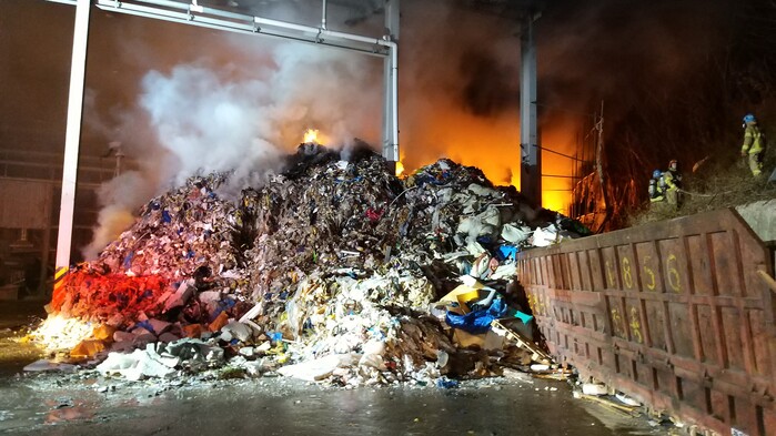 이날 최초 발화는 CCTV상 벽면 없는 창고 외부에 적재된 폐기물에서 시작되어 파쇄폐기물 200톤 전체 소실, 집게차 2대소실, 컨베이어벨트 1대가 소실되었다.