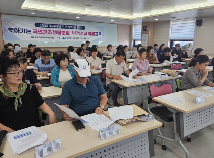 [인천=문찬식 기자] 인천 미추홀구(구청장 이영훈)는 도화1동 명예사회복지공무원 50여 명을 끝으로 총 5개 동, 200여 명의 명예사회복지공무원을 대상으로 진행한 ‘2025년 국민기초생활보장 부정수급 예방 시범 교육’을 성공적으로 마무리했다고 1일 밝혔다.