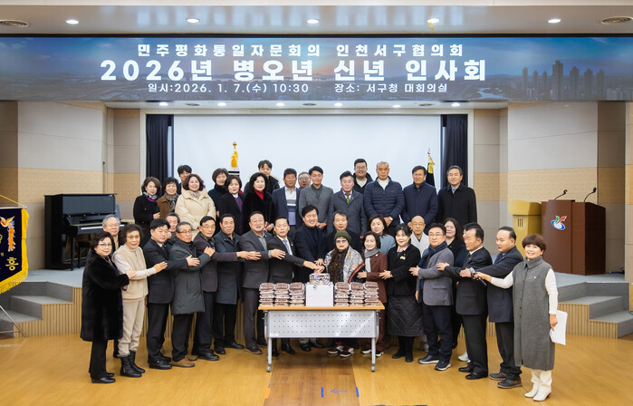 [인천=문찬식 기자] 민주평화통일자문회의 인천서구협의회(회장 유정학)는 지난 7일 서구청 대회의실에서 자문위원, 서구청장, 내빈, 관계공무원 등 40여 명이 참석한 가운데 병오년 희망찬 새해, 힘찬 출발을 위한 ‘2026년 신년인사회’를 개최했다.