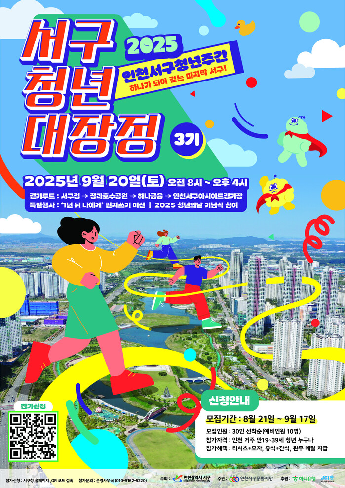 17일까지 청년 참가자 30명을 선착순으로 신청받을 계획으로, 인천에 거주하는 만19세~39세 청년은 누구나 참여할 수 있다. 참가자에게는 티셔츠, 모자와 함께 완주 메달도 지급될 예정이다.