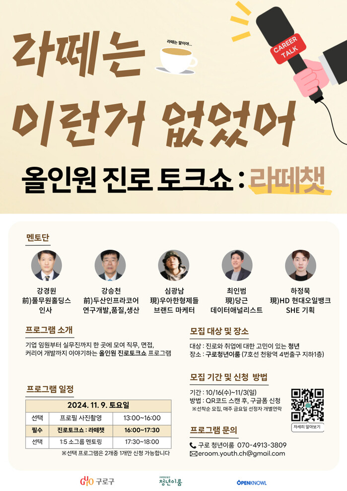 [시민일보 = 박소진 기자] 구로구(구청장권한대행 엄의식)가 오는 9일 구로 청년이룸에서 ‘올인원 진로 토크쇼, 라떼챗’을 개최한다.