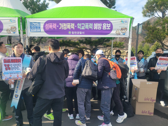 이날 홍보는 24회 합천벚꽃마라톤대회에 참가한 선수와 군민들, 합천군을 찾은 관람객 상대로 가정폭력·아동학대·성폭력 등 관계성 범죄의 선제적 예방활동을 펼쳐 군민들의 인식개선과 공감대 형성을 위해 홍보 물품을 교부하여 효과적인 홍보 활동을 진행했다.