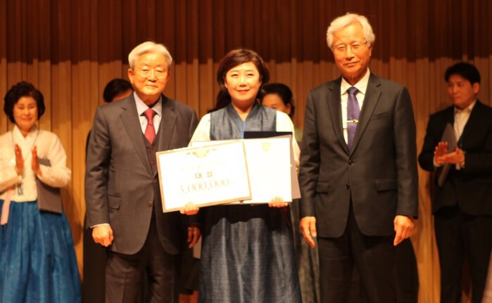 | ▲ 제33회 '재능시낭송대회' 대상 수상자 권예성씨(가운데)가 박성훈 재능그룹회장(왼쪽), 유자효 한국시인협회장(오른쪽)과 함께 수상 기념 촬영을 하고 있다.(사진=재능문화 제공) |