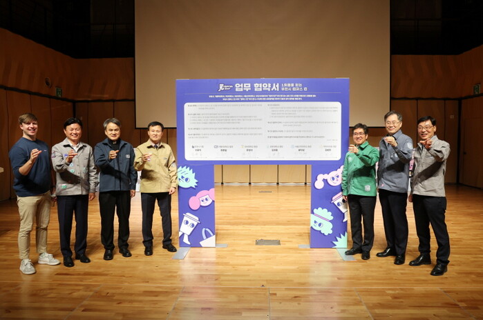 경기 부천시가 지난 4일 부천아트센터에서 ‘캠퍼스 컵 크루’ 1기의 발대식을 성공적으로 개최했다. 이번 행사는 ‘1회용품 없는 경기 특화지구 조성사업’의 일환으로, 부천시 지역내 4개 대학 캠퍼스를 대상으로 1회용품 사용 줄이기와 다회용컵 사용 촉진을 목표로 추진됐다. 사진은 조용익 시장(왼쪽 두 번째) 및 참석자들이 컵을 쥐고 있는 포즈를 취하고 있는 모습. (사진=부천시청 제공)