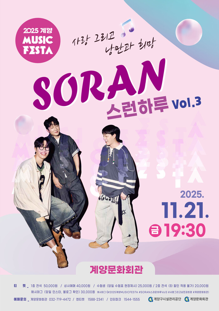 [인천=문찬식 기자] 인천 계양구시설관리공단(이사장 박성민)은 오는 11월 21일과 22일, 28일 ‘2025 계양 뮤직 페스타(MUSIC FESTA)’ 콘서트 3종을 계양문화회관에서 선보인다.