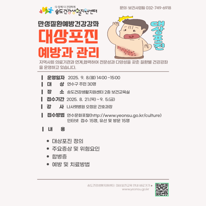 [인천=문찬식 기자] 인천 연수구(구청장 이재호) 송도건강생활지원센터는 오는 9월8일 지역 주민을 대상으로 ‘대상포진 예방과 관리’ 강좌를 개최한다.