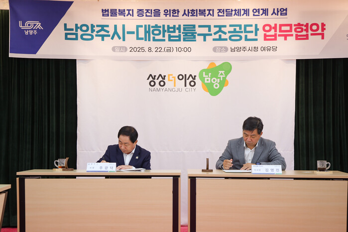 [남양주=최광대 기자] 남양주시는 22일 시청 여유당에서 대한법률구조공단과 경기도 최초로 법률지원 서비스 체계 구축을 위한 업무협약을 체결했다.