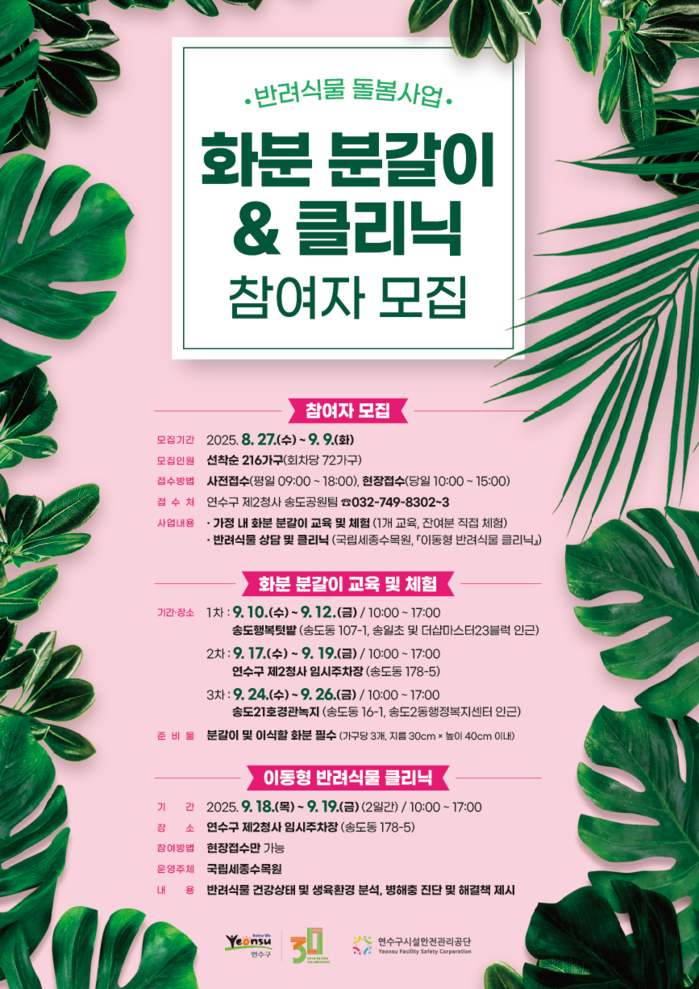 이번 사업은 연수구의 예산 및 행정 지원을 바탕으로 연수구시설안전관리공단의 화분 분갈이 체험 행사, 국립세종수목원의 이동형 반려 식물 클리닉으로 구성됐다.