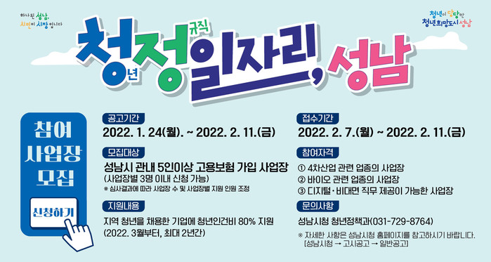 성남시 청년정책과 관계자는 “코로나19로 어려움을 겪는 기업의 부담을 덜어주고, 지역 청년에게는 양질의 일자리를 제공하기 위해 추진하는 사업”이라고 말했다.